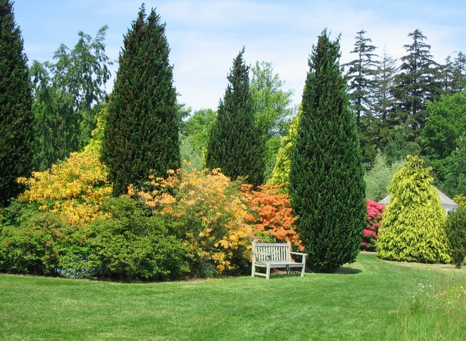 Хорошо, если на участке высажены не только лиственные, но и хвойные деревья. Они великолепно сочетаются с любыми растениями, и круглый год имеют зелёный цвет. Наибольшей популярностью пользуются ель, туя. Часто на участках сажают сосну «мопс», «австрияка». Также отлично будут смотреться бук, ясень или дуб.